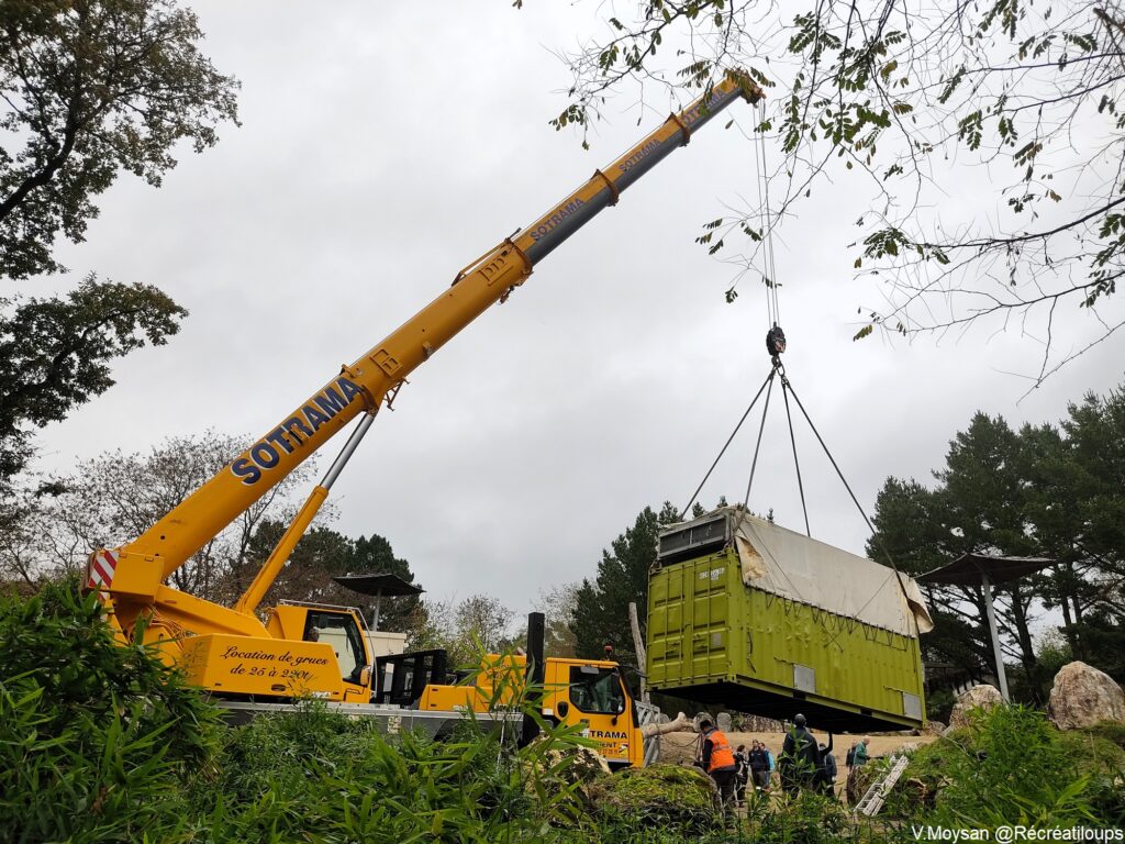 Quatre heures supplémentaires seront nécessaires pour lui permettre de cheminer de l’entrée du parc à l’éléphanterie. Pour cela, l’équipe des Terres de Nataé avait mis en place un important dispositif technique permettant son transfert du semi-remorque en provenance de la République Tchèque à un camion plus léger, par le biais d »une grue ; une seconde grue permettra de déposer la caisse de transport en douceur et avec une précision impeccable à l’entrée du pré-parc de l’éléphanterie.