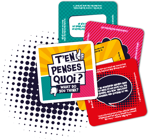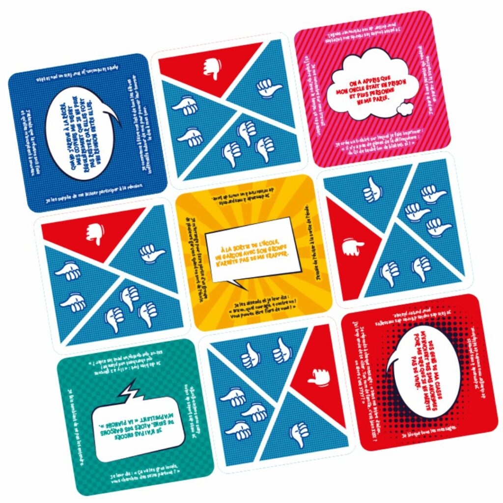 - 36 cartes « évaluations » : Elles sont constituées de pouces allant d’un pouce rouge à 3 pouces bleues, pour « liker » plus ou moins chaque situation proposée.