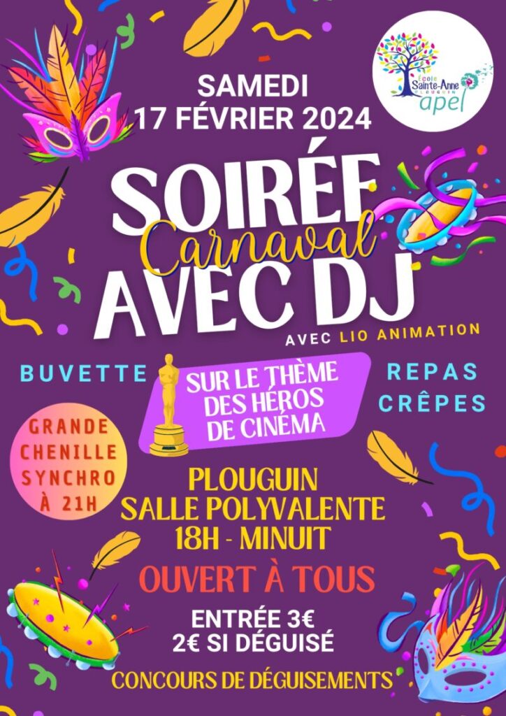 Soirée déguisée avec DJ le 17 février à 18h à la salle polyvalente à Plouguin. Venez en famille,